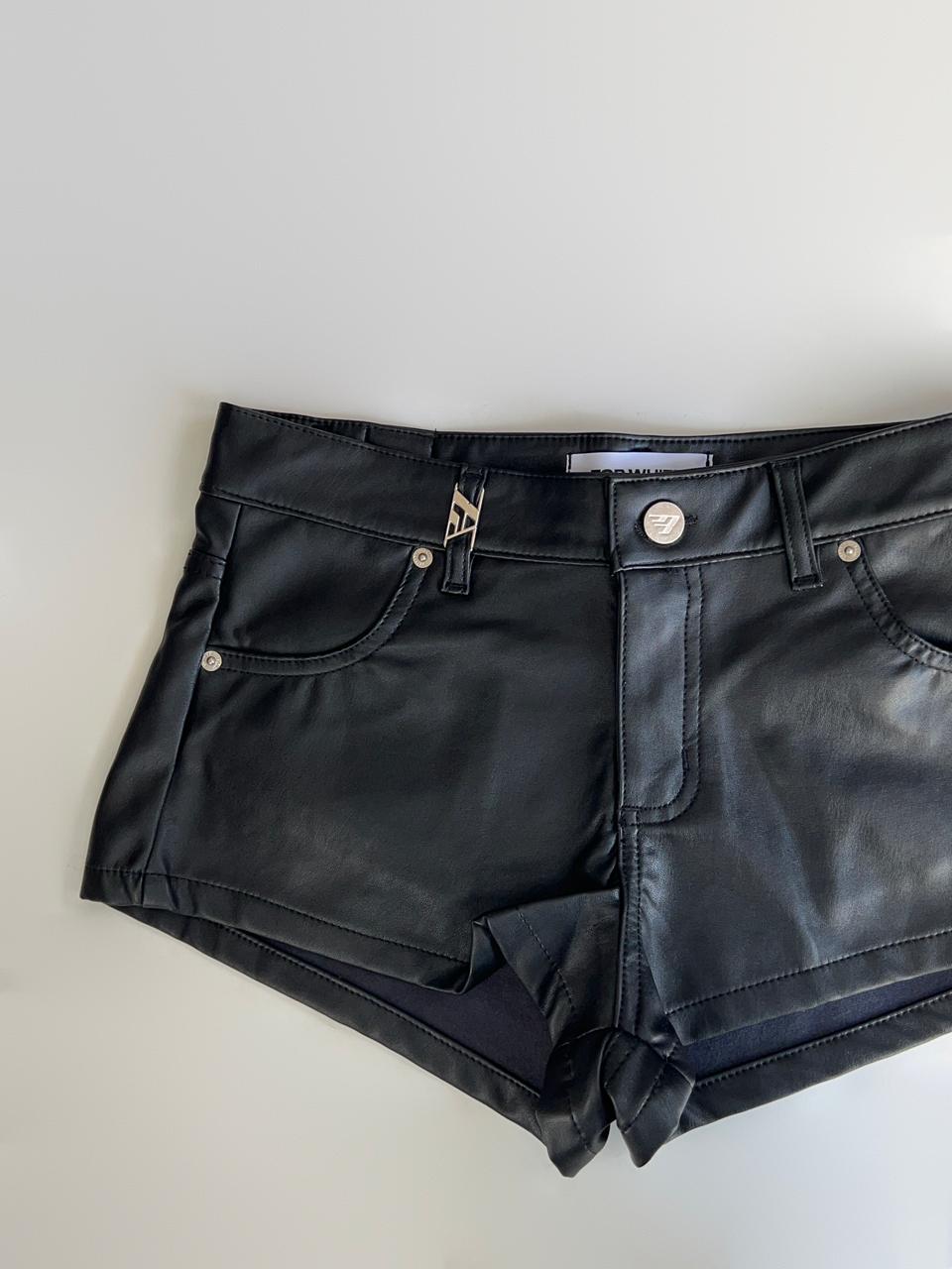 Short de cuerina. Detalle de presilla en delantero con avío pasador metálico personalizado. Cintura con 5 pasacintos, cartera de cierre. Dos bolsillos delanteros con remaches y dos bolsillos clásicos traseros. Acceso a la prenda mediante cartera de cierre metálico ykk y botón metálico personalizado.
