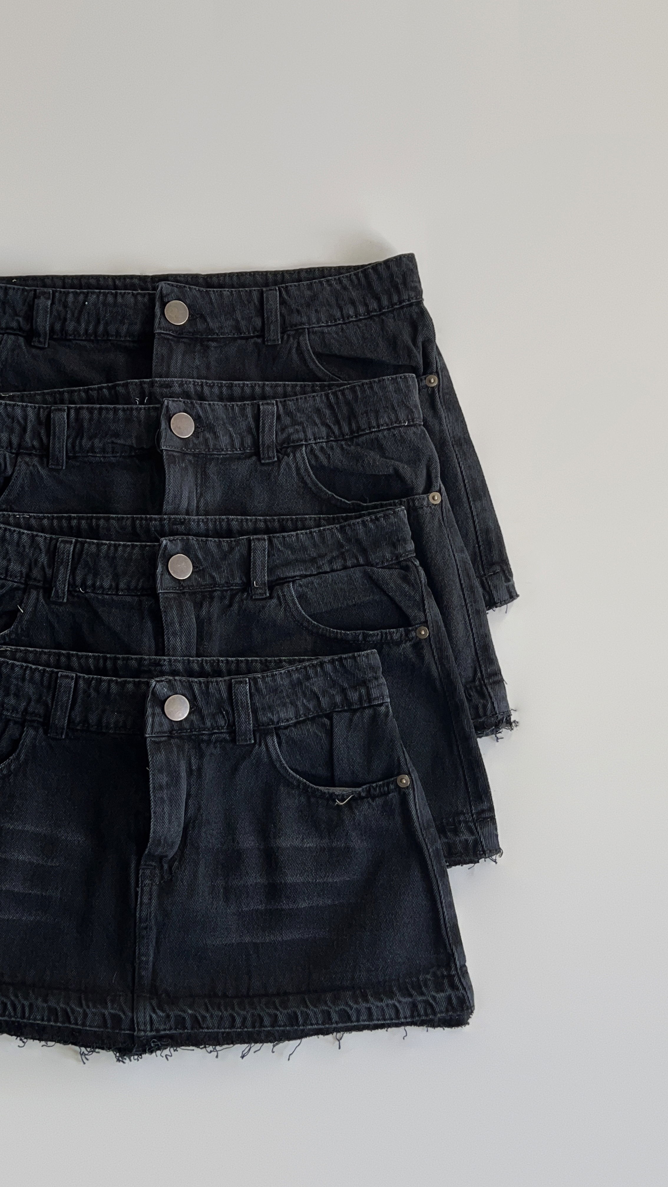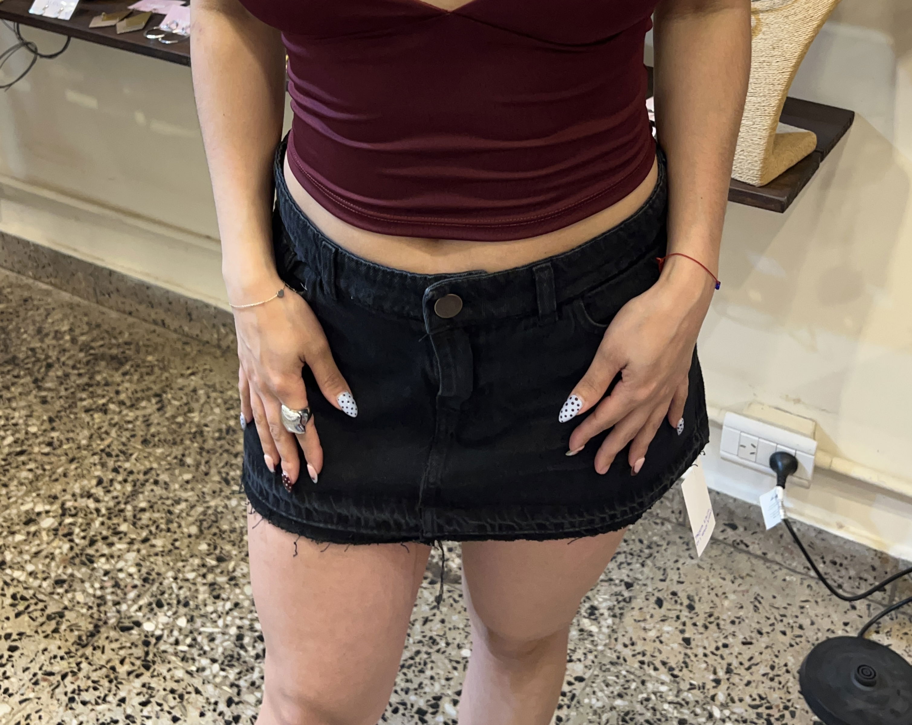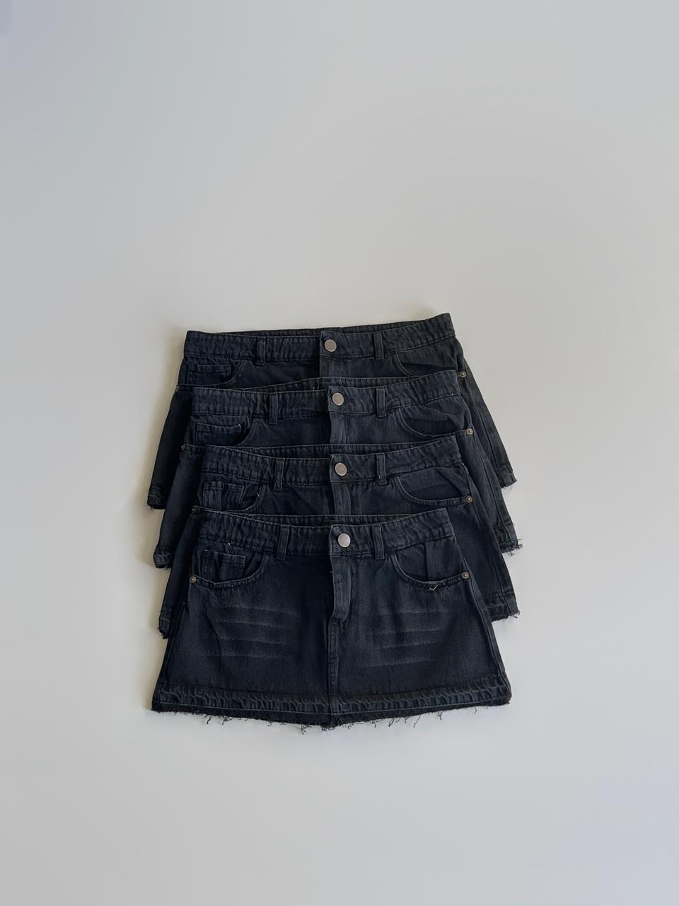Mini de jean rigida con terminaciones deflecadas. Tiro bajo.