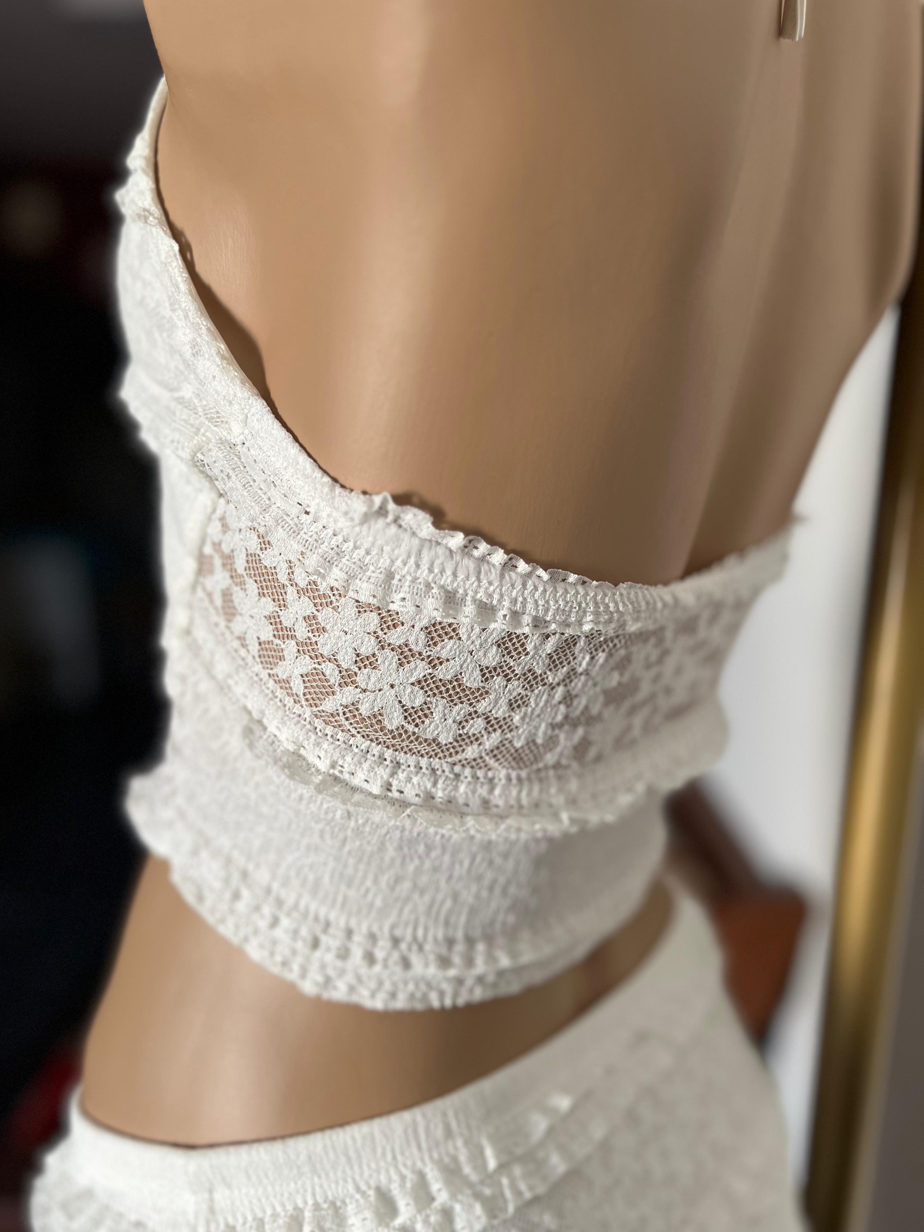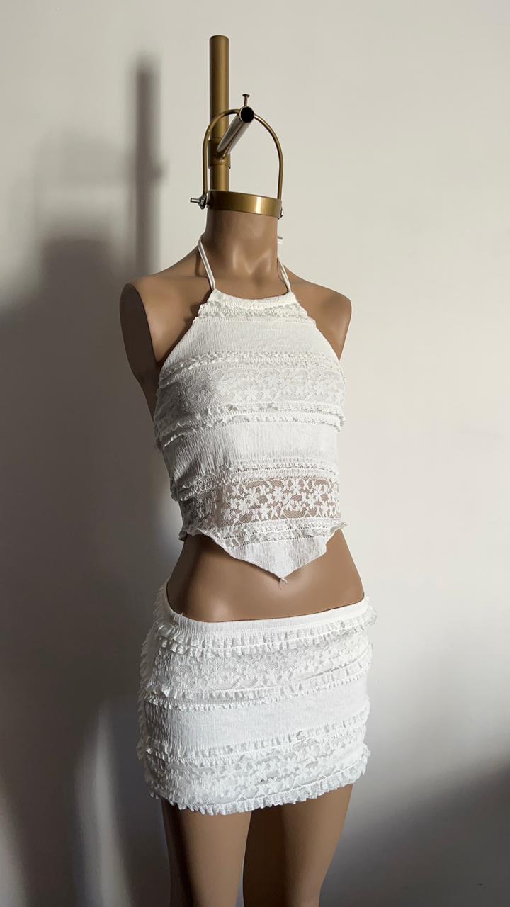 Set blanco de encaje. Es talle unico, la tela es elastizada y cede hasta un M.