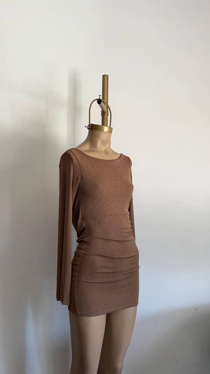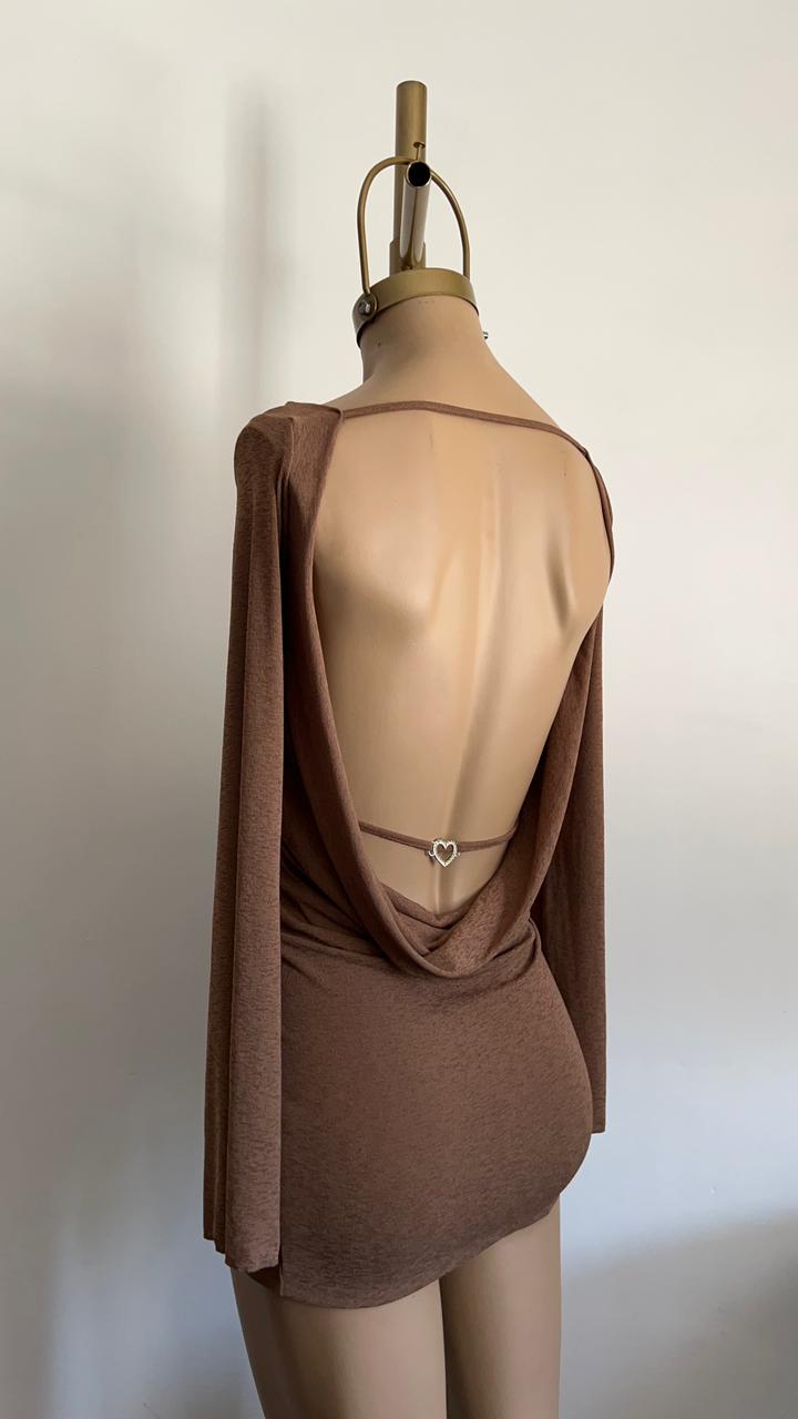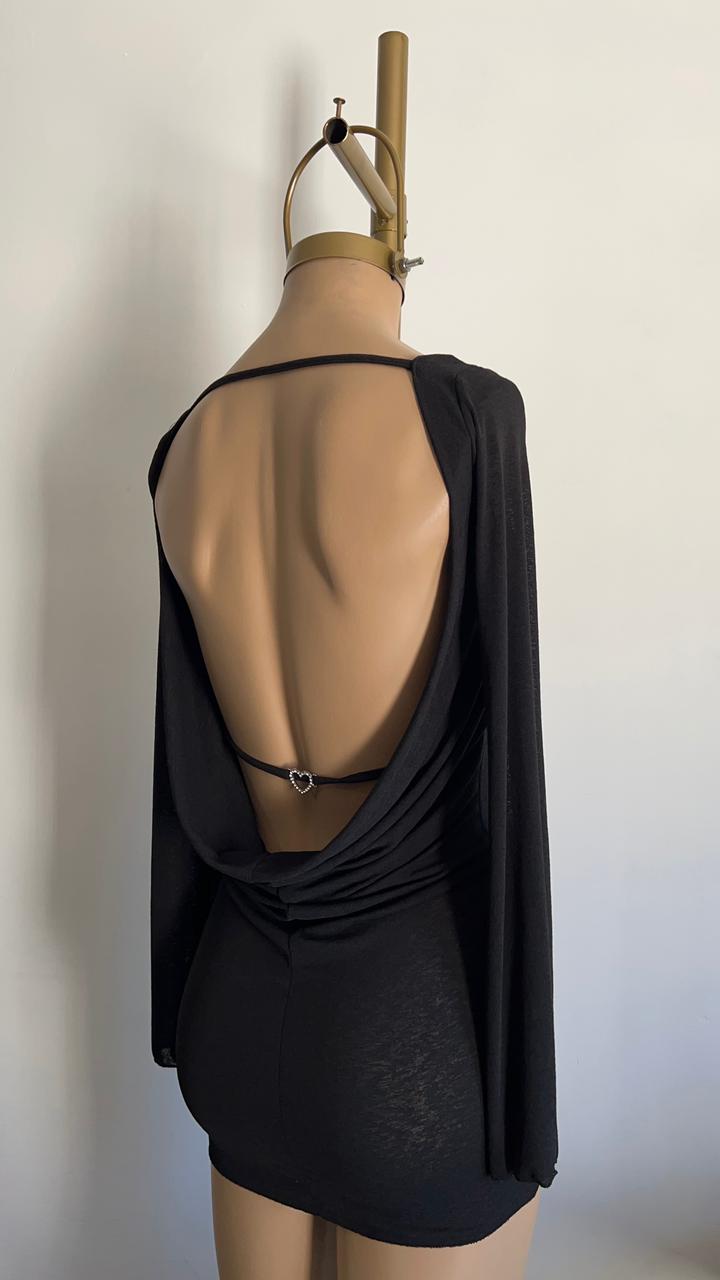 Vestido corto con espalda descubierta y una manga larga que crea un efecto drapeado elegante. Ideal para eventos nocturnos