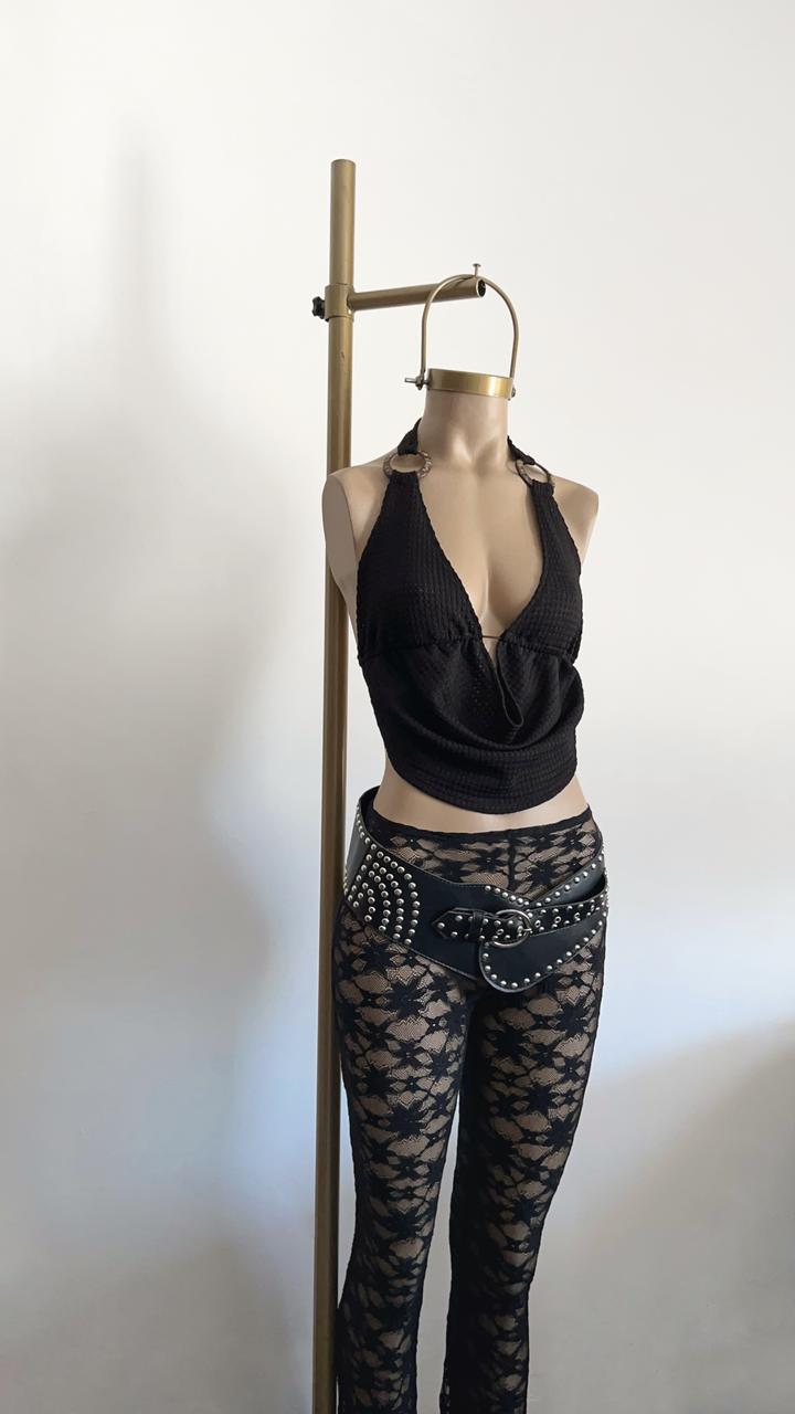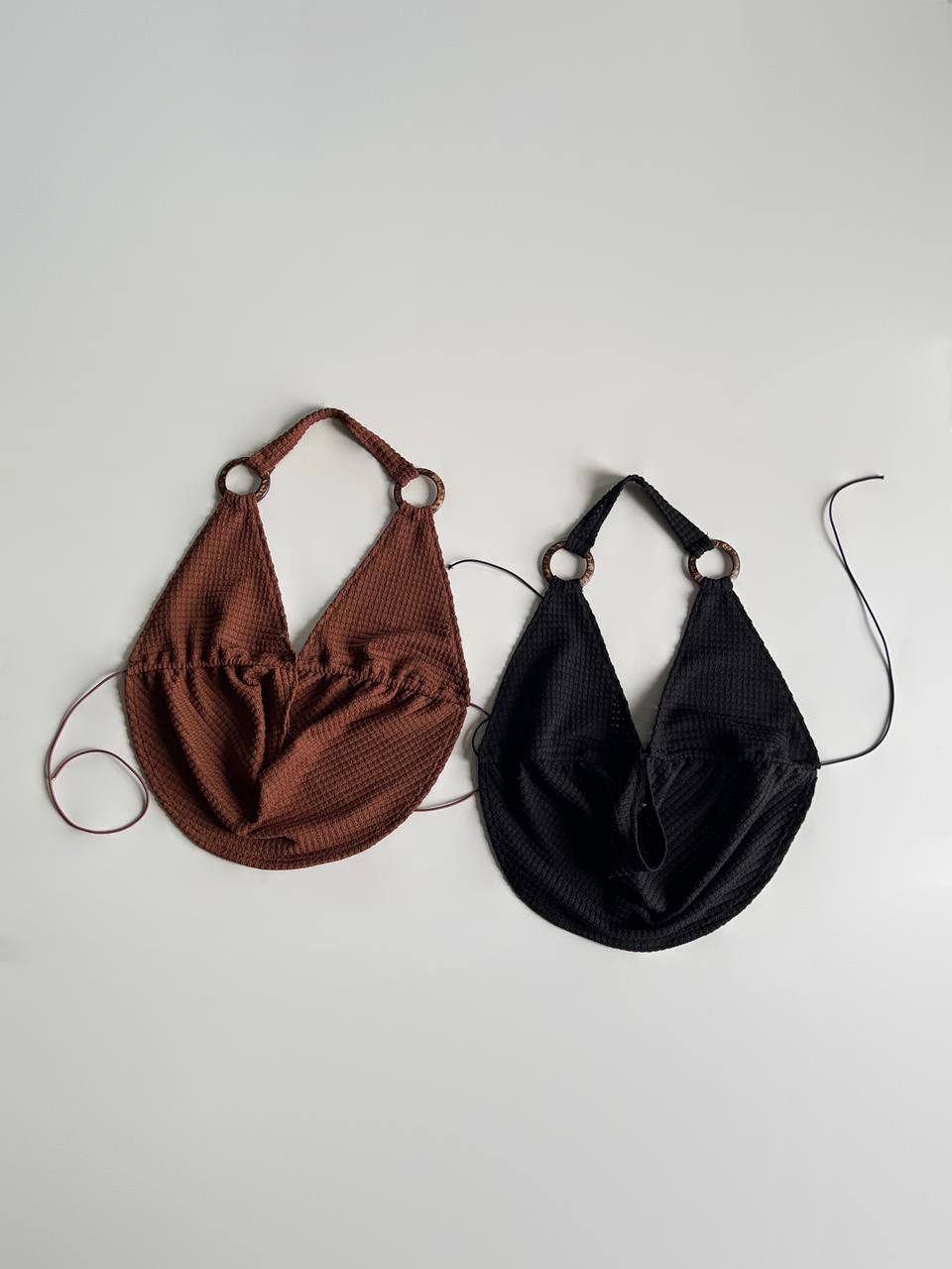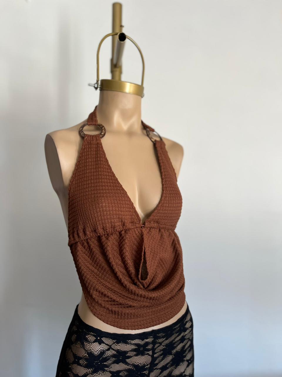 Top de waffle crochet, escote en buche y argolla de madera, ideal para look veraniegos o casuales nocturnos.
